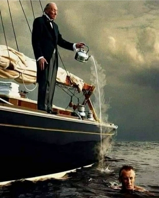 لم أندهش من تلك النظرة الجرانيتية المتكبّرة التي تعلو وجه الخادم، لم يكن ما يفعله عبثًا، فهو يؤدي دوره الذي يؤجر عليه بإتقان . وقفته مشدود القامة، يمينه المفرودة بجانبه، شماله التي تقبض على برّاد كبير، تتساقط منه قطرات ساخنة في مياه البحر.