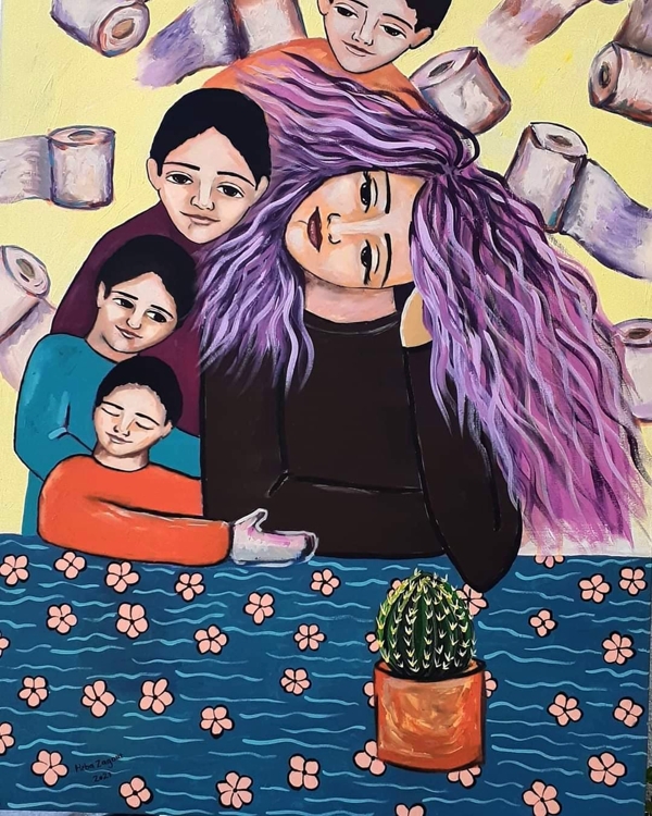 ولا يمكننا إ1غفال التصاق الأنثى بلوحات هبة زقوت وتحويلها إلى بطلة رئيسية في لوحاتها، تحكي حكايتها ومعاناتها، وتفرد لها مساحةً للتعبير عن نفسها وعن همومها المتنوعة في ظل التهميش الذي تتعرض له بسبب واقع الاحتلال الإسرائيلي وواقع الفقر الذي ترزح غزة تحت نيره والواقع الاجتماعي الذي يتأثر بالعاملين السابقين.. ففي دورها الأنثوي الوطني تظهر المرأة بزيها التقليدي الفلسطيني تارةً حزينة ومنتظرة، وتارةً متفائلة، وتارةً قويةً ومناضلة برغم القيود والحصار في إشارة إلى جدار الفصل العنصري وأيضاً في إشارة إلى واقع الأسيرات الفلسطينيات في السجون الإسرائيلية اللواتي يحلمن بحياة ٍطبيعية بعيدا ًعن واقع ٍ يصادر أحلامهن، كما ترصد في لوحاتها الأمومة بحنانها والتصاقها بأطفالها وأيضاً بخوفها عليهم بسبب الأوبئة والأمراض، في إشارة إلى الوضع الشائك الذي يمر به العالم بعد انتشار جائحة الكورونا، والذي رمزت له في لوحة لامرأة ترتدي الكمامة وبين يديها نبتة الصبار التي أشارت إليها في العديد من اللوحات كعنصر ٍأساسي أو جزءٍ من الحكاية الحزينة أو مزداناً بزهورٍ جميلة في لمحةٍ تفاؤلية بواقع ٍقادم أكثر إشراقاً بعد السنوات الصعبة التي مرت علينا جميعاً، والتي كانت متواجدة ًفي إحدى لوحاتها تتوج رأسها مع أجنحة ٍ ملائكية وسط الكثير من الأزهار لترسل رسالةً بأن الربيع سيملأ الأرض والحياة رغم أن الصبار يعتلي رؤوسنا، ولا نغفل وجود حمامة السلام في عددٍ من الرسومات التي تؤكد على الإصرار على التمسك بالأمل، عدا عن وجود مساحة للفتاة الحالمة التي ترتبط بالأزهار بصورةٍ وثيقة فهي حولها أو تزين شعرها أو ترافقها بملامح هادئة مطمئنة.