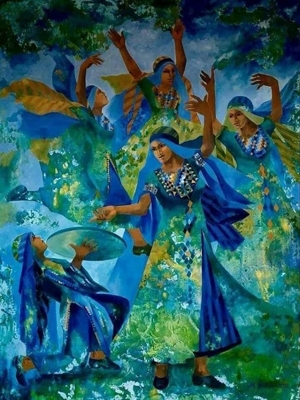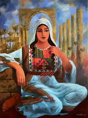 يحتفي الفنان الفلسطيني ماهر ناجي بالمكان ورموزه، بعلاقة الفلسطيني بأرضه، بمقاومته.. بالخصب المتجددة مع المواسم كتعبير عميق عن الفلسطيني الذي ينبت من أرضه كسنابل القمح، بالمرأة.. لكن المرأة في لوحات ناجي تحولت إلى رمز عميق الدلالة.. إنها البطولة بكل صورها.. في هيئتها، ألوانها، ثيابها.. حضورها الذي يصور الحضور الفلسطيني الطاغي على مدى قرن من زمن المعاناة والاحتلال.