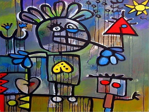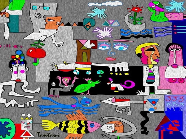 فنلحظ دون أدنى شك البعد الحالم في كثير من لوحاته وكأننا نتجول داخل مخيلة طفلٍ صغير، ممتلئةً بالصور والأفكار والأسئلة والأحلام، كما تفيض بالوجوه والألوان والتصورات التي يحاول فيها أي طفل فهم هذا العالم الكبير والمزدحم بالأحداث التي يفهمها (الكبار) ويملكون في تصورهم اجاباتٍ لكل سؤالٍ يخطر ببالهم مهما بلغت صعوبته، فيسافرون عبر الخيال إلى كل مكان تصله أدمغتهم الصغيرة لتزيل كل الحدود، فتكشف الكون بدءاً من عالمها الخاص لتمر بعوالم الآخرين المتشعبة والممتلئة بالتفاصيل، كما نرى الطفولة في لوحات الفنان عصام طنطاوي وكأننا نرتكز على الفن بنظرةٍ ذات مرجعية متصلة بعلم النفس فنلحظ تصوراته الأولى للحياة والكائنات والطبيعة وعالم البالغين، كما تستمر بشكلٍ متوارٍ وغير مباشر كرسومٍ على الجدران والبيوت القديمة وكأن هناك نوعاً من المزاحمة الوجدانية للطفولة بين محاولات ٍ لظهورها بشكل ٍعلني عبر هذه النقوش الصغيرة على جدران الزمن كنوعٍ من الاحتجاج على تهميشها، أو كشكلٍ من أشكال التذكير بها وإن كان ذلك بصوتٍ منخفض النبرة.
