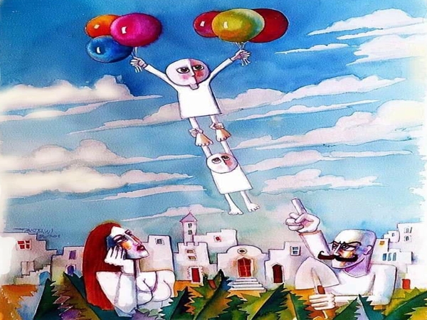 لكن هذا ليس كل شيء. فبرغم الجانب الحزين للطفولة في بعض أعماله نرى في البعض الآخر انتصاراً لها من خلال منحه للطفل مقدرةً خاصة على الطيران بعيداً عن القهر والقمع والكبت، فيظهر الطفل محلقاً مع بعض البالونات الملونة التي تمثل الفرح، وتهبه أيضاً القدرة على مساعدة أطفالٍ آخرين ليحظوا ببعض الأمل فيتشبثون بقدميه ليطيروا معه وكأنهم يستعيدون طفولتهم من جديد، كما نرى أنه يعطيهم القدرة على الاختيار حيث لا يحظى الكثير من الأطفال بفرصة اختيار واقعهم من خلال لوحةٍ يطير فيها الطفل خلف حمامةٍ بيضاء تجسد السلام والحلم الذي يتمناه، وتبدو بمثابة أملٍ لطفلٍ آخر يتمنى أن يطير مثله لكنه مكبلٌ بالكثير من القيود التي تفرضها عليه بيئته ونرى مرارتها في نظرة عينيه وذراعيه العاجزين اللتان ترغبان في التحول إلى أجنحة ليغير واقعه الذي يقوض أحلامه. لكنها لا تزال حافزاً للاستمرار في المحاولة.