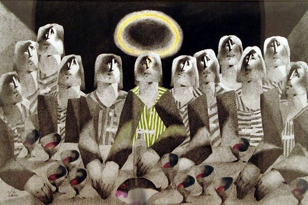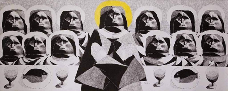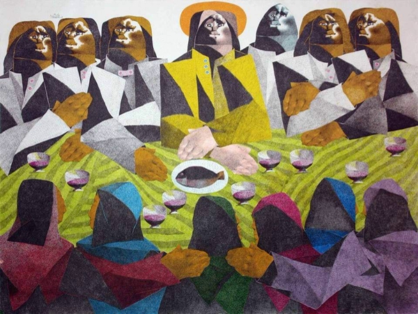 فقد أتت بالمائدة لتقطع عرض اللوحة فيما يشبه الحد الفاصل بين منزلة السيد المسيح ومن دونه من التلاميذ. وقد تقدم شخص المسيح اللوحة محتلا دور البطولة المنطقي في العمل. وتقع خلفه المائدة موضوع عليها أربعة كؤوس موزعة بالتساوي على يمين ويسار السيد المسيح ويتوسط كل كأسين منهما صحن عليه سمكة، ثم يأتي التلاميذ الاثني عشر على صفين مستعرضين مكونين من ستة شخوص يجلس كل إثنين الواحد خلف الأخر وتحيط برأس كل منهم هالة بيضاء. وقد أتت اللوحة خالية تماما من الأحبار الملونة فيما عدا تلك الهالة الصفراء التي تحيط وتعلو رأس السيد المسيح. واللوحة تذكرني في أجوائها اللونية والخطية بتلك التناولات الخاصة بالطبيعة الصامتة للفنانة رباب نمر والتي مارستها مستعينة بالأبيض والأسود فقط في واحدة من أهم دراسات الأبيض والأسود المنتهجة لخط التعبيرية والتي برعت فيه وتميزت أعمالها فيها بمذاق بصري مميز.