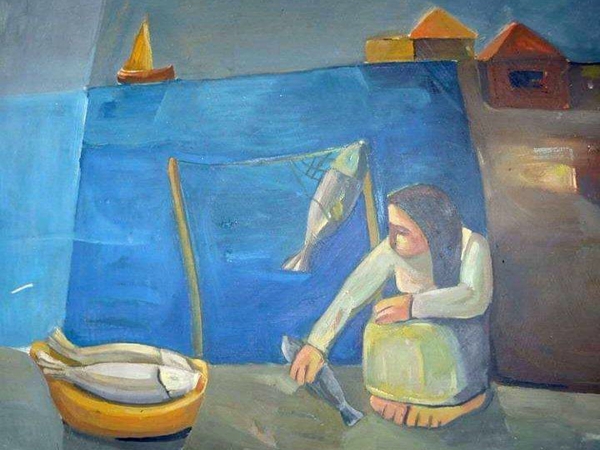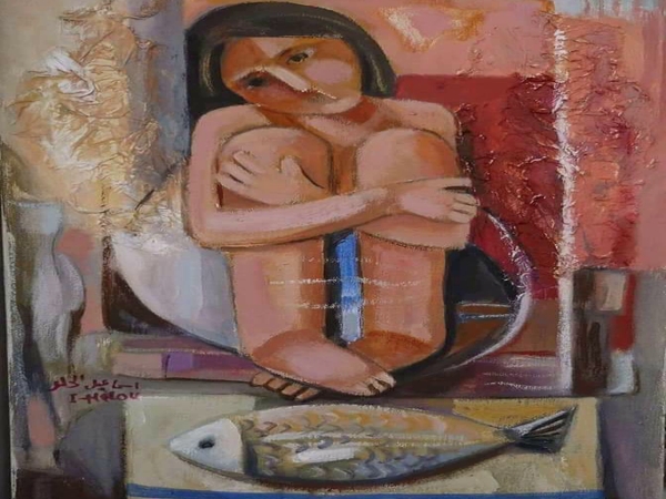 تتواجد الأسماك بشكلٍ كثيف في لوحات الفنان اسماعيل الحلو وكأنها تمثل (البقية الباقية) التي تتجه الأنظار صوبها بعينٍ من القلق والترقب والخوف من ضياعها، إذ أنها لا تعني الزاد والطعام بمعناه التقليدي بل تعني الكثير من الأحلام والمشاعر التي أصبحت هشة وغير مؤكدة ككل شيءٍ يحيط بنا ويجعلنا نفتقد إلى الشعور بالطمأنينة، وهو ما نلحظه في كثيرٍ من اللوحات التي تجلس فيها بطلتها أمام منزلها أو خارجه وكأن البيت بمفهومه الواسع وجدرانه الأربعة لم يعد مكاناً قادراً على احتواء الأشخاص وحمايتهم وتوفير ملاذٍ يتسع لهم ولأحبتهم، وهو ما نراه في نظرات أغلب الشخصيات الباحثة عن أمومةٍ ما تستطيع استيعابهم واستيعاب الطفولة واستيعاب وطنٍ جريح بكل تفاصيله التي تحكي عبر صمتها الكثير والكثير، وتقدم الأجزاء غير المكتملة في حكايتها عبر نماذج لا تحمل وجوهاً واضحة أو تماثيل مبتورة الأطراف وكأن الواقع بتر الإنسان من الداخل والخارج وجعله يعيش في دوامةٍ مستمرة لا يعرف كيف يخرج منها وسط هذه الحالة الاغترابية بامتياز..