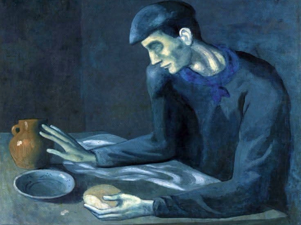 في لوحة “وجبة الفقير الأعمى”، نرى رجلاً أعمى يجلس على مائدة بسيطة يتحسس إبريق ماء وبيده قطعة خبز جافة، وهنا يهيمن الأزرق البارد على المشهد، مما يزيد من إحساسنا بفقره المدقع وعزلته. حتى الضوء الشاحب الذي ينير اللوحة يبدو وكأنه مشبع بالزرقة، مما يعزز جو الكآبة واليأس.