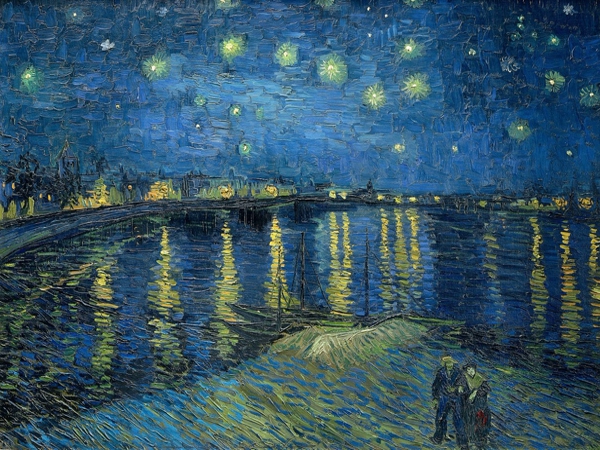 لوحة «ليلة النجوم على نهر الرون»، تُصَور مشهداً ليلياً تنعكس فيه أضواء النجوم والمصابيح على صفحة الماء موحية بالسكينة، وفي مقدمة اللوحة رجل وامرأة يتمشيان بجانب النهر. وتعكس اللوحة وحدة الفنان وتأملاته للعالم حوله، وكأنه في عزلة نفسية يراقب العالم ويتأمله عن بعد، وبرع فان خوخ في هذه اللوحة كعادته في تتبع تأثيرات الضوء في الليل؛ وهو ما نلاحظه في لوحات كثيرة، منها “شرفة مقهى في الليل” التي تصدرت هذا الموضوع، ولوحة “ليلة النجوم” السابقة، والملاحظ دقة الفنان في وضع انعكاسات الضوء في أماكنها، ما يؤكد أنه نقلها بدقة من الطبيعة.